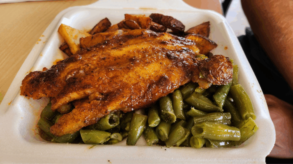 After choosing from a diverse, Cajun-inspired menu, customers order at a walk-up counter where they can see the entire kitchen, including two large rice cookers from which the cooks shovel out their famous spicy rice each day. After a short few minutes, they are handed their food in styrofoam shells along with plastic utensils.
