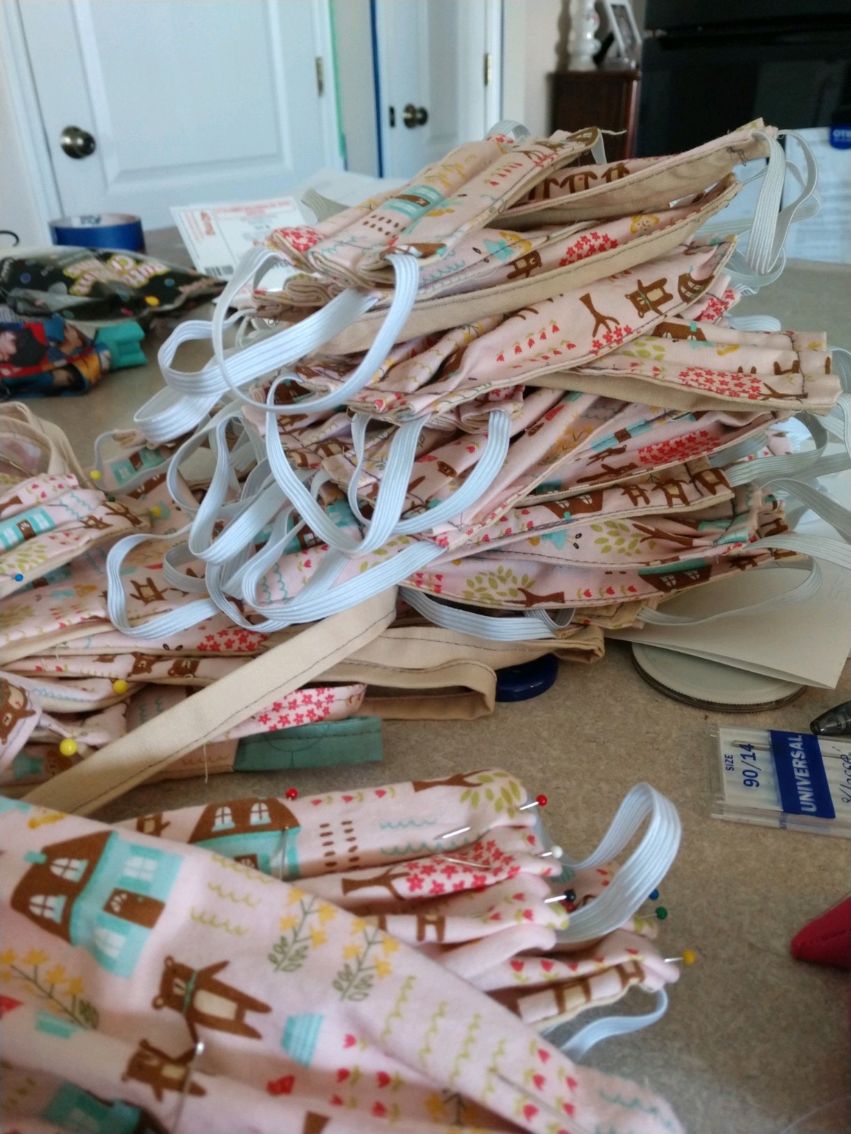 The crew makes two versions of masks. One style is form-fitting and the other is a general rectangle-shaped piece.